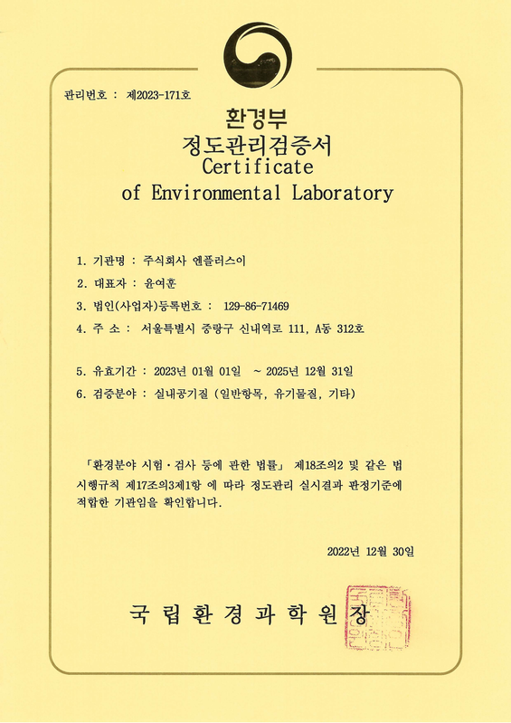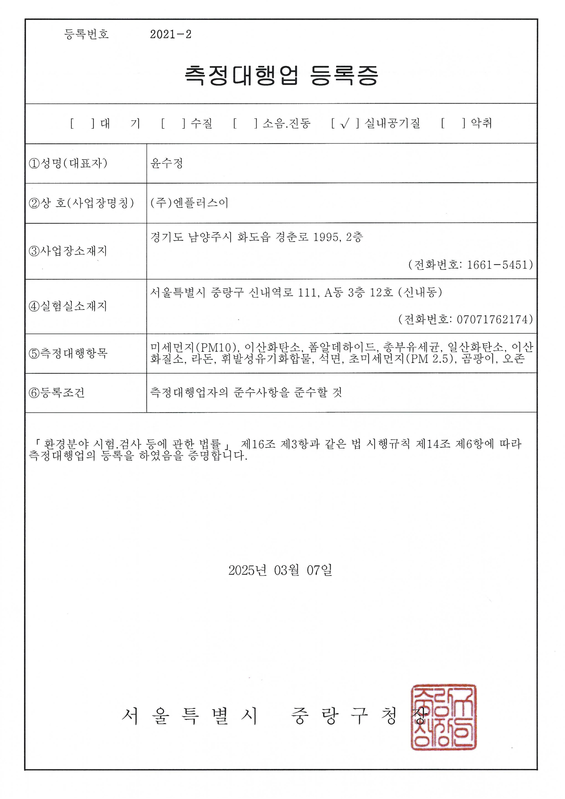 실내공기질 측정대행업 등록증